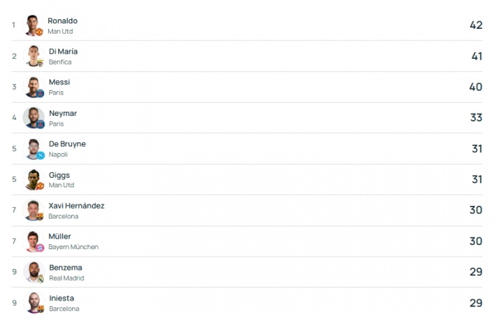 10月02日讯 欧冠联赛阶段第二轮,德布劳内两送助攻,那不勒斯主场2-1击败葡萄牙体育。德布劳内当前欧冠助攻31记,与吉格斯并列第五,C罗、迪马利亚、梅西前三。欧冠历史助攻榜前十(数据来自欧冠官网)1-C罗:42助2-迪马利亚:41助3-梅西:40助4-内马尔:33助5-德布劳内:31助5-吉格斯:31助7-哈维:30助7-穆勒:30助9-本泽马:29助9-伊涅斯塔:29助之后姆巴佩、维尼修斯24助排在第15,基米希23助排在第21。