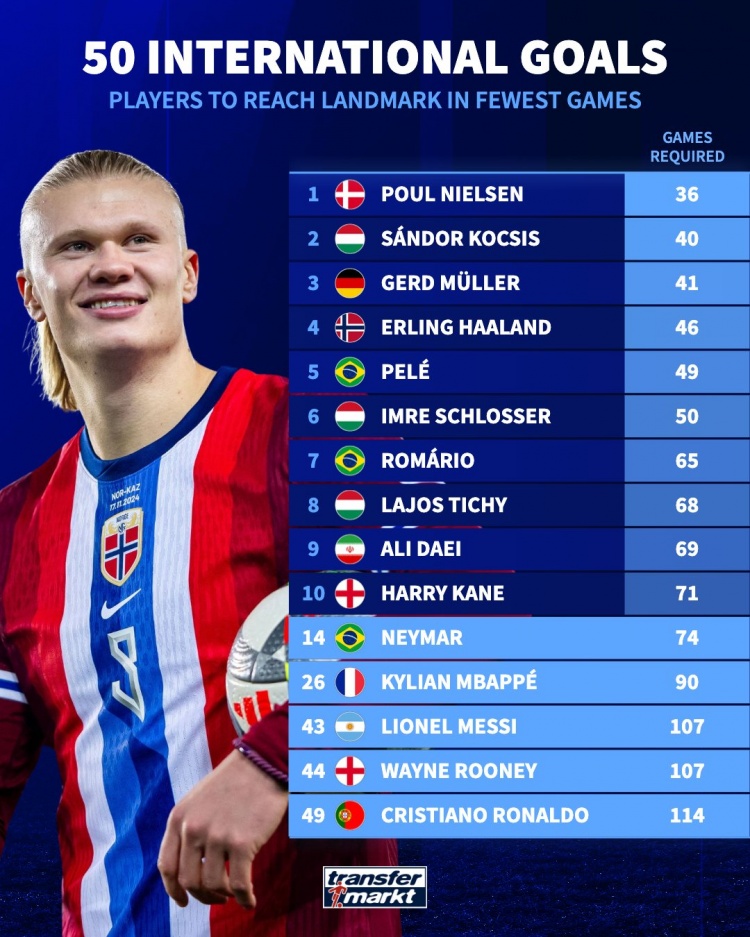 现在的位置: 首页 > 英超新闻 > 国家队最快达50球所用场次:哈兰德46场第4、梅西107场和C罗114场