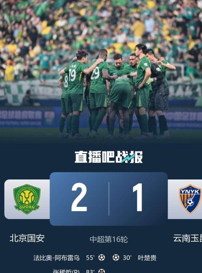 4连胜&16轮不败领跑!国安2-1逆转云南玉昆 张玉宁替补助攻+造点