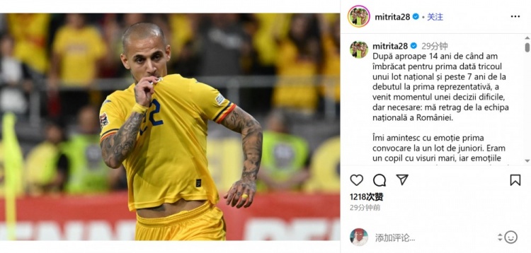米特里策:决定从罗马尼亚国家队退役 我坚信这是最正确的选择