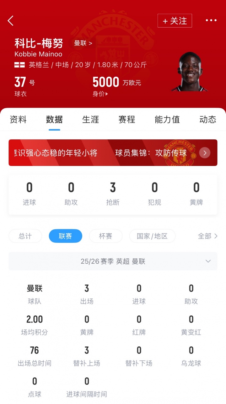 09月27日讯 今日曼联公布对布伦特福德首发阵容,20岁中场梅努继续担任替补,本赛季英超全部担任替补。值得一提的是,据此前罗马诺等多家媒体消息,梅努在今夏因担忧出场时间曾申请租借离队,但曼联拒绝了这一提议。这名20岁的中场小将目前德转身价5000万欧元。本赛季英超出场三次全部为替补,且总计时长仅为76分钟。