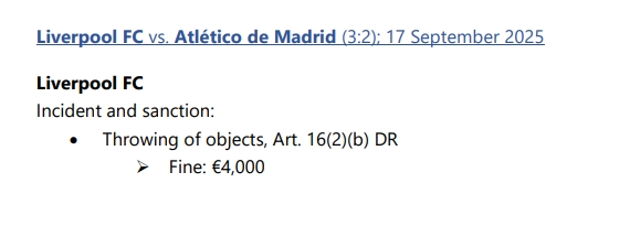 10月01日讯 欧冠首轮比赛,利物浦3-2战胜马竞。本场比赛中,利物浦因为球迷投掷物品,违反《欧足联纪律准则》第16(2)(b)条,俱乐部被罚款4000欧元。马竞方面,与利物浦的比赛中,西蒙尼与一名在90分钟内持续辱骂他的利物浦球迷发生了冲突,随后吃到红牌。西蒙尼的行为违反体育道德,被欧足联处以欧冠停赛1场的处罚,因此西蒙尼将无法在欧冠主场对阵法兰克福的比赛中现场指挥。