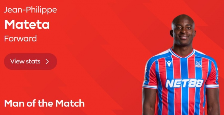 本场比赛水晶宫前锋马特塔上演帽子戏法,赛后他也当选